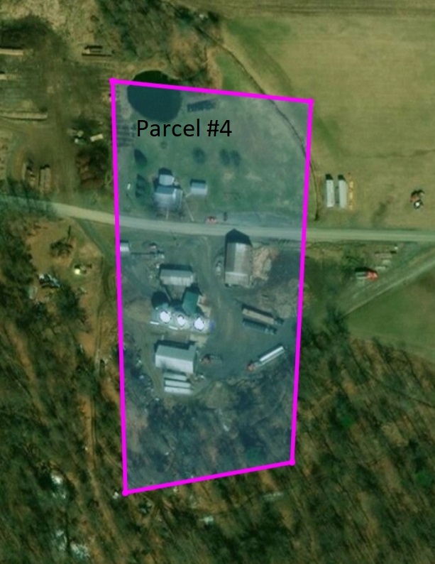 Parcel #4: 606 Pole Cat Rd.- Country house on 4.75 acres, overlooking a pond. Improvements include a pavilion, bank barn, a 40’x60’ truck shop, 2- 10,000 gal. underground fuel tanks and a grain handling system with a dumping pit, a 20,000 bushel bin, a 12,000 bushel bin and a 10,000 bushel bin. Apx. Annual Taxes: $2,325.00. Down Payment day of the auction: $15,000.